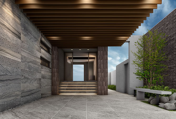 外観からエントランス、そして居室へと続く一連の空間設計に